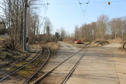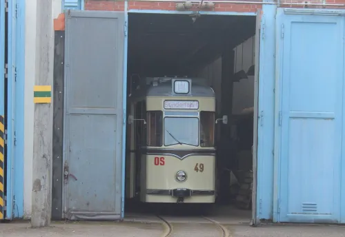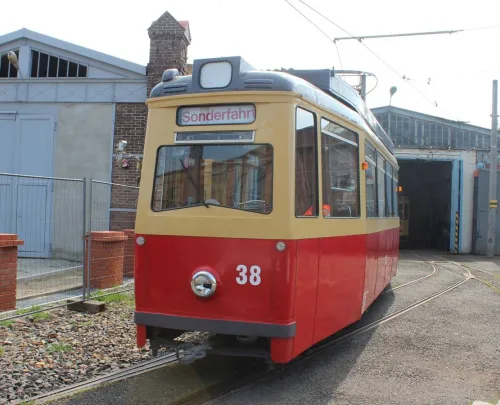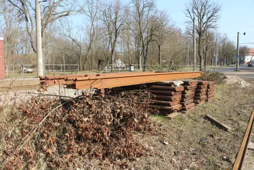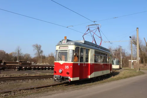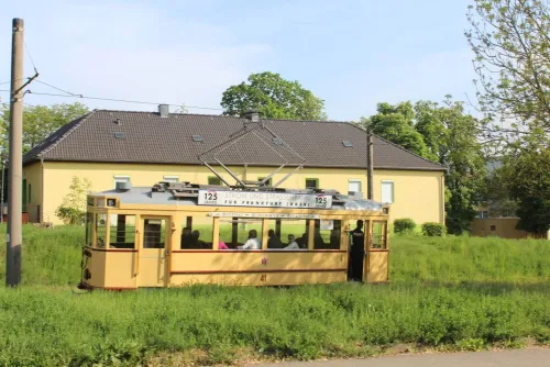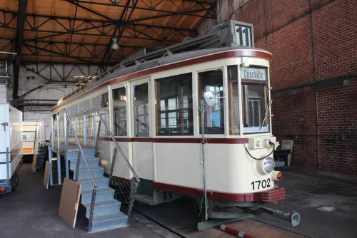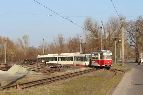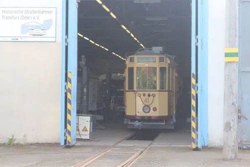 Da in Frankfurt (Oder) das Ende der Tatra-Bahnen naht, habe ich heute einen Straßenbahnspaziergang gemacht und tatsächlich keine einzige Tatra im Liniendienst gesehen. Los ging es in der Bachgasse. Im alten Depot der Straßenbahn residiert jetzt der "Historische Straßenbahnen Frankfurt (Oder) e.V." Vor der Halle und durch die geöffneten Tore in der Halle waren einige Schätze zu sehen:
