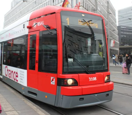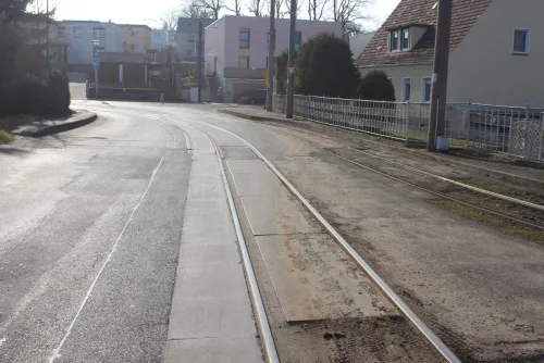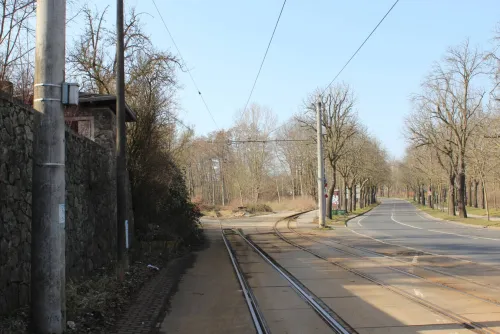 Dem Triebwagen 41 begegnete ich dann immer weider an verschiedenen Stellen, und zwar in der Innenstadt in der Heilbronner Straße (2 Bilder), in der Wallensteinstraße, in der Güldendorfer Straße ganz nahe am Betriebshof (Im Hintergrund ein RS1 der NEB auf dem Weg nach Königs Wusterhausen beim Überqueren der Güldendorfer Straße) und schließlich beim Überqueren des Mühlenwegs: