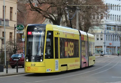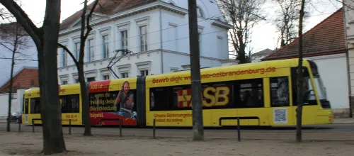 Heute habe ich zum ersten Mal eine von den neuen Skoda-Trams in Frankfurt (Oder) mit Vollwerbung gesehen: