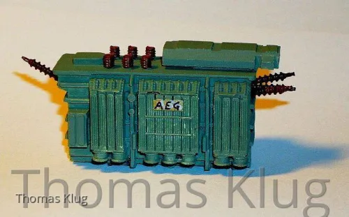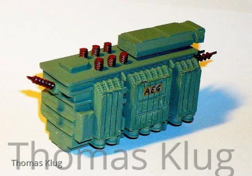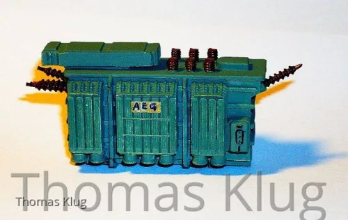 Am Samstag habe ich bei Herrn Lorenz einen Trafo im Rohzustand erworben. Diesen Trafo habe ich in einem hellen grau-grün gelackt (mit Pinsel und Revell Farben) und die Isolatoren angebracht und braun gelackt.