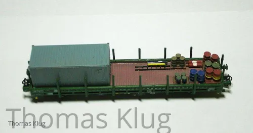 ...im weiteren Verlauf der Arbeiten wurden die beiden Flachwagen (Modelle von SDV und Umgestaltung von Ralph Lusansky - hobbyschrauber) so hergerichtet, das der eine den Bagger tragen kann und die Greiferschaufel auf 2 Schwellen abgelegt werden kann und auf dem 2. Flachwagen mit Container wurden die notwendigen Betriebsstoffe und - mittel, wie Diesel, Hydrauliköl, Getriebe- und Motorenöl, Fett und andere Schmierstoffe, geladen.