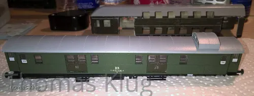 Grundlage sind hier Ersatzteile von Tillig, (Packwagen in Einzelteilen - Gehäuse, Bodenplatte und Dach) Peho KKK, ein alter BTTB Dosto und dessen Türen und Fenster. Was noch fehlt sind die Gummiwulst Übergänge und die Drehgestelle.