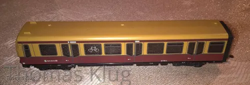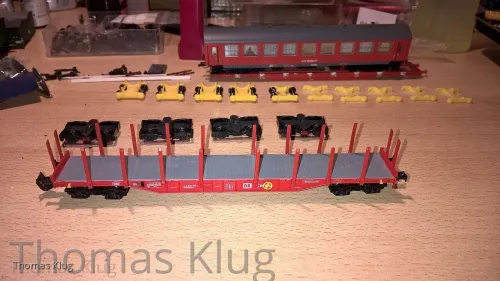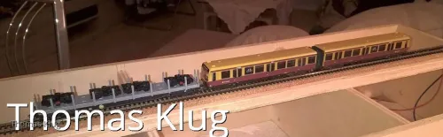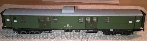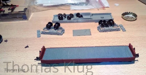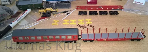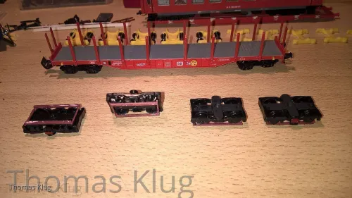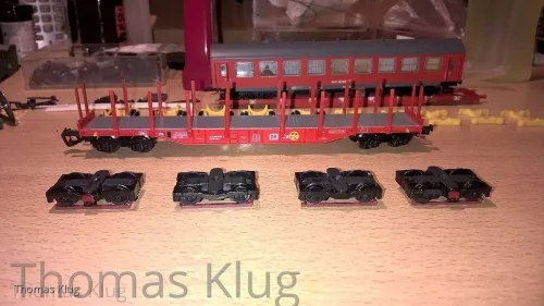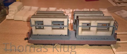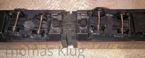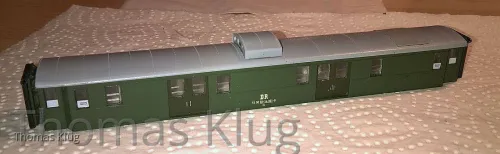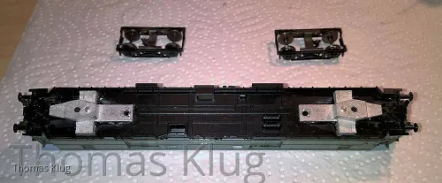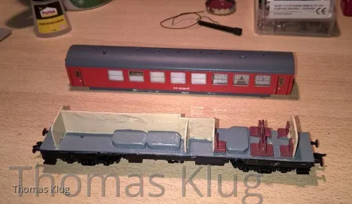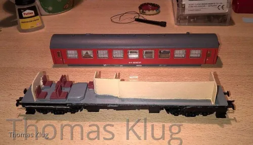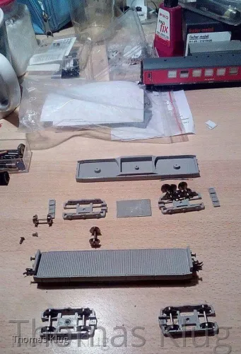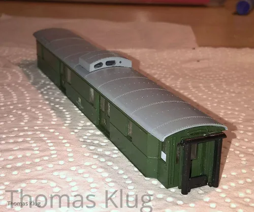 Die restlichen Türen (vom Dosto als Spender) wurden eingebaut, die Gummiwulstübergänge angepasst, die PeHo Kulissen und die Drehgestellhalter montiert, die Zugführerkanzel in die Mitte des Daches versetzt, das Loch im Dach geschlossen und Drehgestelle angebracht... ![]()