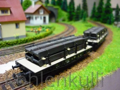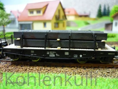 Die Stahlträger sind PVC-Profile die ich entsprechen bemalt habe. Kleine Funierstreifen benutzte ich für die Nachbildung der untergelegten Hölzer und mit etwas Zwirn wurde die Ladung gesichert.
