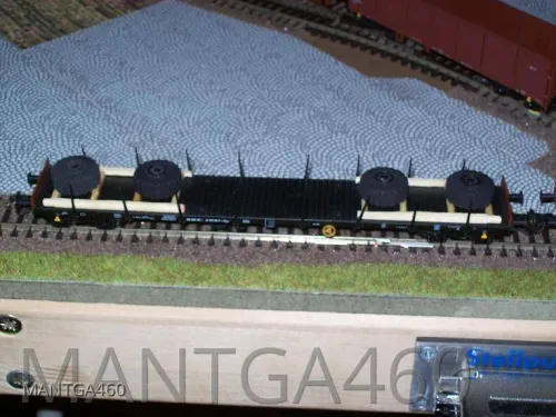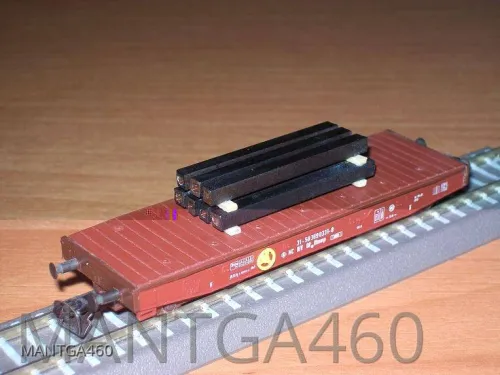 4-Kant Kunststoffprofil habe ich verwendet um die Stahlladung herzustellen . Darunter klebt ein Magnet und im Wagenboden ist eine Metallplatte damit die Ladung auf dem Wagen nicht verrutscht .