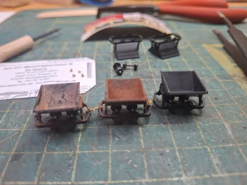 Warum für eine TT Feldbahn H0 Kipploren verwendet ? Die Kippmulden gibt's von 0,5 ... über 1,5m3, entsprechend unterschiedlich sind auch die Lorenrahmen in ihren Abmessungen und die Spurweiten (ich hab in den 90ern sowas mal in Kleinserie hergestellt). D.h. die H0 Kipploren bilden somit maßlich die größten Vorbilder in TT nach die es gab.... Ließen sich diese nicht auch rollfähig machen : https://www.modellbahnshop-lippe.com/Feldbahn/Feldb…ell_257247.html
