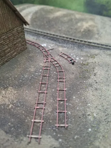 Wobei nur die erste Weiche - Einfaedelung TTe /TT funktionsfaehig ist. Die zweite ist eine Tillig TT Weiche und hier wurde einfach das TTe Gleis eingefuegt.