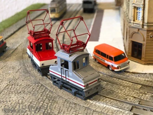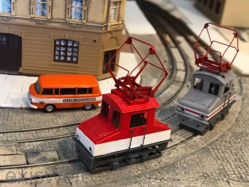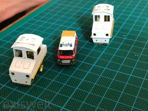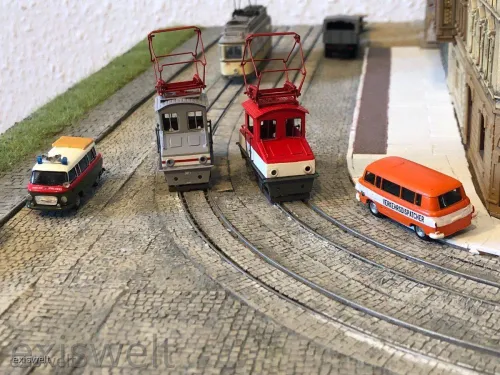 Christian und ich sind mit unserer traditionellen Nach-Herrentagsbastelei fertig geworden. Bei den Beiden kleinen Loks fehlt noch der Antrieb, der VP-Barkas von Herpa, ist jetzt zu einen richtigen Modell geworden, der Skoda S105 hat seine richtige Farbe bekommen und auch ein neuer Dispatcher Barkas ist entstanden. Das Original war bei den Erfurter Verkehrsbetrieben im Einsatz.