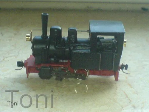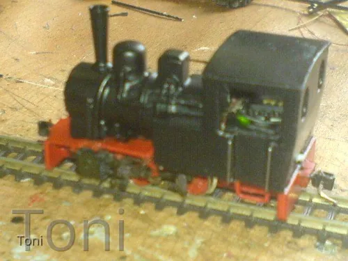 Der Kessel wurde aus einem Stück CU- Wasserrohr "gedrechselt" und Führerstand sowie die Kesselaufbauten entstanden z.T. aus Evergreen und div. Draht- und Blechresten.