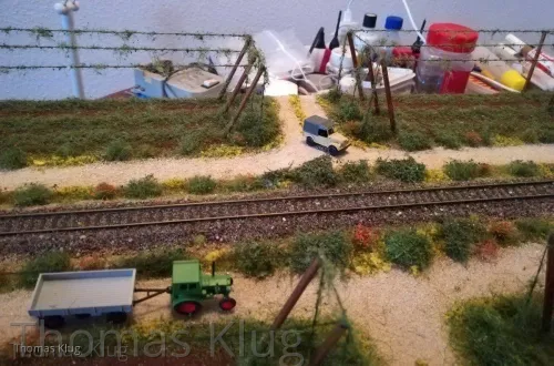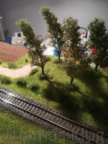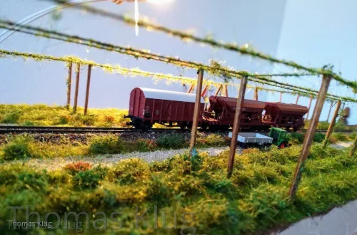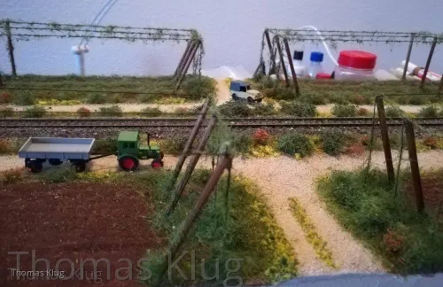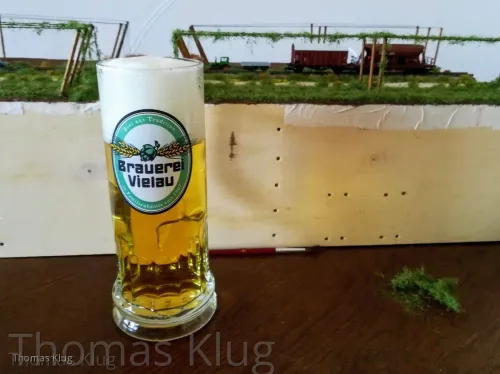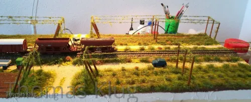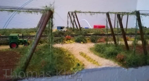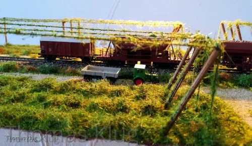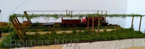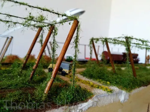 Ja sicher folgt noch die Bepflanzung mit Hopfenranken, allerdings werde ich mir die selbst machen, aus Schnur und Beflockung. Allerdings muss ich mir das Beflockungsmaterial noch holen, nur ist mein Modellbahnhändler, welcher das passende Material hat, derzeit im Urlaub.