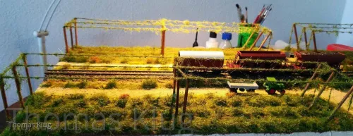nachdem mein Modellbahnhändler des Vertrauens aus dem Urlaub zurück ist, habe ich mir die notwendigen Materialien für die Bepflanzung geholt und angefangen die Hopfen Felder zu begrünen. Als erstes mache ich die Trageseile und Pfosten und später folgen die Ranken.