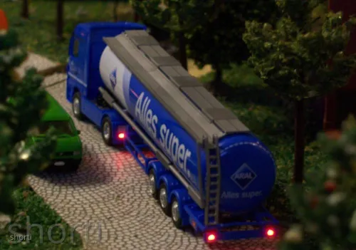 Mein erster Umbau ist ein MB Actros von Herpa, dieser hat Front- und Heckbeleuchtung bekommen sowie Nummernschilder. Insgesamt sind 6 LEDs verbaut worden. Beim bearbeiten der Fotos ist mir jedoch aufgefallen das am Anhänger das Nummernschild schon wieder weg ist.... :wand: