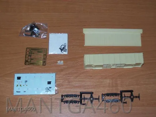 Der Wagenkasten samt Plane sowie einige Zurüstteile sind aus Resin . Ätzteile sowie Drähte für Griffe u.A. liegen dem Bausatz auch bei , ebenso Nassschiebebilder . Den Lieferumfang seht ihr auf dem Bild .