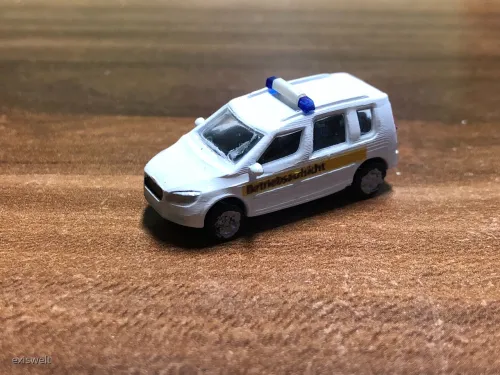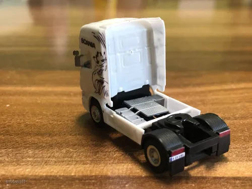 Seit ca 4 Jahren lag das Modell schon fertig, bis auf die Peilstangen und Rückspiegel unbeachtet in der Bastelkiste. Heute hab ich Zeit gefunden alles zu montieren. Das Modell basiert auf einen 3D Druck von Passivbahner lediglich das Fahrerhaus mit den Peilstangen und Rückspiegeln wurde ergänzt. Der Aufbau lässt sich kippen.