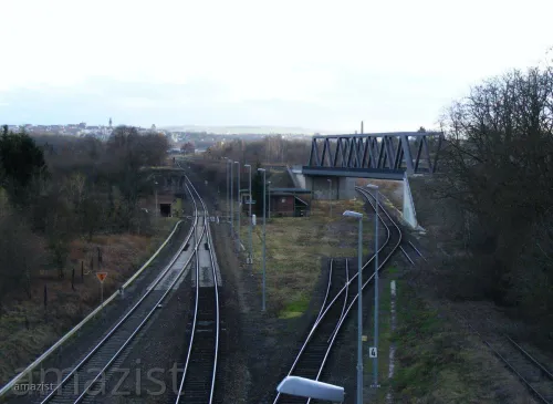 Heute gibt es dort nur noch eine Brücke (Weißenfels-Zeitz) über der Einfahrt zum Güterbahnhof. Links geht es eingleisig nach Zeitz Pbf.