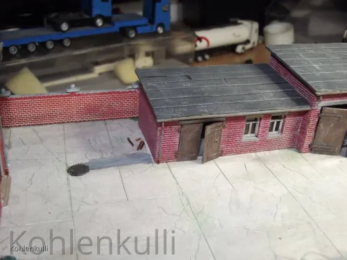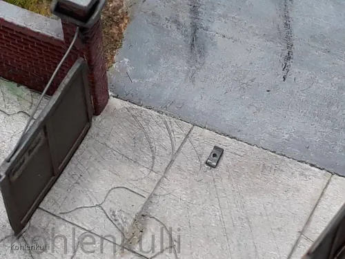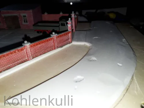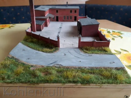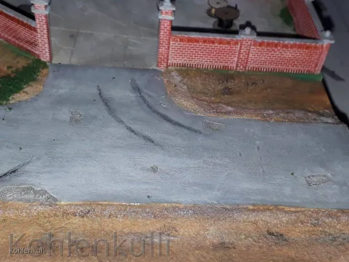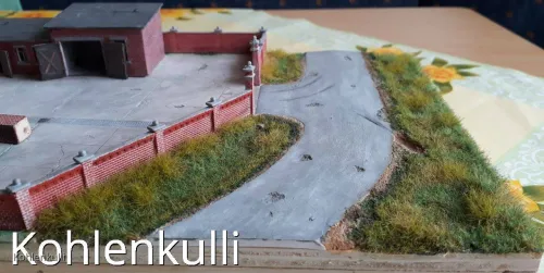 Die Strasse ist mit der gleichen 3 mm Plaste Platte gemacht, wie der Hof, die Schlaglöcher ausgeschnitten, Unebenheiten eingedrückt und in der Mitte unterfüttert, damit eine Neigung zum Strassenrand entsteht. Der Strassengraben ist mit Sand aufgefüllt und dann alles mit Farbe behandelt. Beflockt ist mit dem Noch Grasmaster und unterschiedlichen Grasfasern.