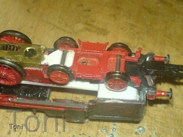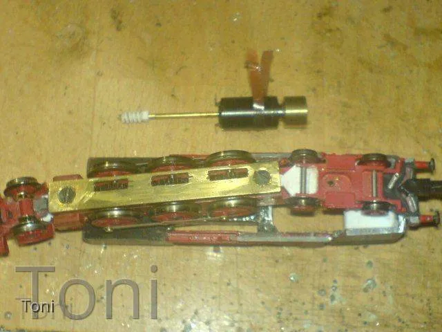 Hinten am Nachlaufgestell wird dann noch eine Stromabnahme angebracht und so kann die Lok dann mit 5 Achsen ihre Spannung vom Gleis beziehen, was dem Laufverhalten doch zuträglich sein sollte...