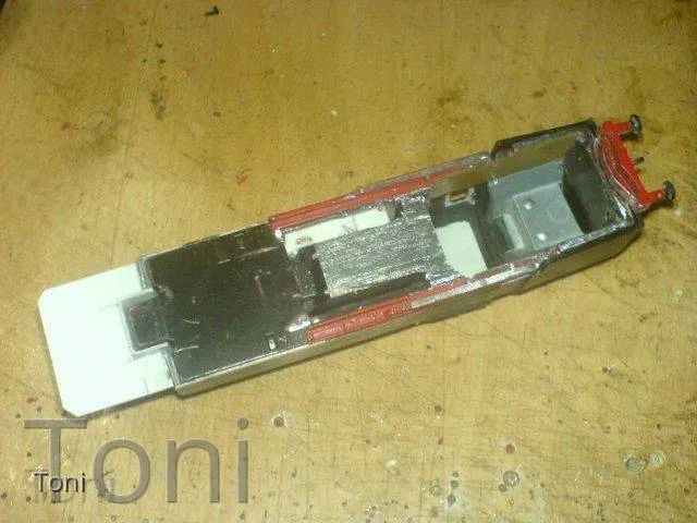 Zu dem Zwecke wurde am Fahrwerk nach hinten zu, zum Tenderkasten hin, noch eine kleine Platte angeklebt, auf die hernach noch eine richtige Motorhalterung geschräubelt wird.