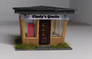 Habe den in der Gruppe gezeigt, und dann hieß es, dass man den nicht mehr nehmen könne, da er vom Maßstab her viel zu groß sei. Das stimmt auch, er ist ca. 1:100, was man vor allem an der Tür sieht. In einem ersten Schritt habe ich durch die Öffnung in der Bodenplatte die abstrakte Papierdeko entfernt, was nicht ganz geklappt hat, weil sie ausgerechnet über der Ausgabeklappe festgeklebt war. Es gibt eine neue maßstäbliche Tür, und die Werbetafel maskiert die restliche Höhe der alten Tür. Aus Litze mit grüner Isolierung habe ich Bierdosen geschnitten, eine davon steht nebst Trinker draußen an der Ausgabe. Rund um den Saum des Kiosks habe ich ein wenig begrünt, da dort natürlich nicht regelmäßig Unkraut gezupft wird.