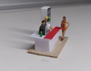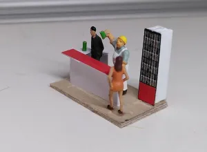 Da die fensterverdeckende Deko raus war, brauchte ich jetzt auch noch ein Innenleben. Es gibt einen spartanischen Tresen und einen Kühlschrank für die Bierdosen. Bei Cindy gibt es nur Bierdosen, die Trinker kommen trotzdem gern, was wohl vor allem an Cindy liegt. Eine Kasse hat und braucht Cindy nicht, sie rechnet direkt in ihre Geldbörse ab, die sie unter dem knappen Kleid versteckt trägt. Derzeit sind zwei Trinker in der Halle, ein Herr im feinen Anzug ist in Gedanken und hat seine Dose auf dem Tresen stehen, der andere, ein Bauarbeiter, prostet Cindy zu.
