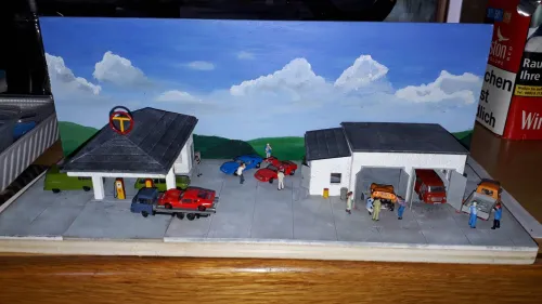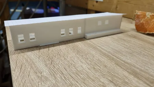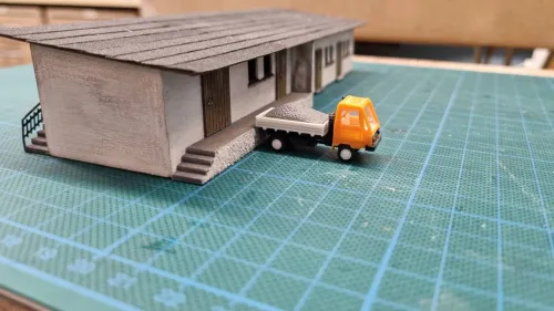 Gefällt mir sehr gut. Wenns mal zu glatt ist, einfach auch mal mit Fertigspachtel zum Malern probieren. Entweder direkt aus der Tube auftragen und nachher schleifen oder den vorher mit Wasser leicht verdünnen, dann ist er besser auftragbar. Hab ich bei meinem kleinen Betriebshofgebäude gemacht. Darunter ist ja Pappe. Da ist dann sogar der Effekt abgeblätterter Farbe entstanden.