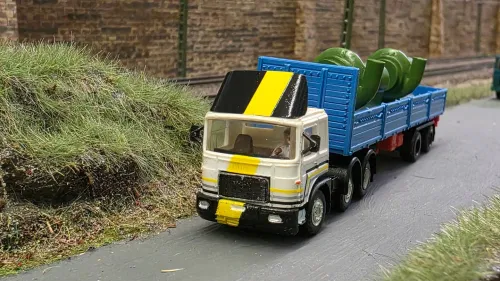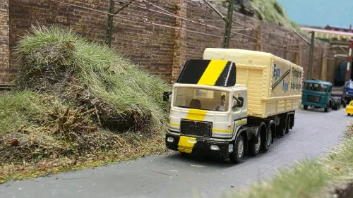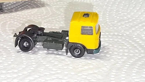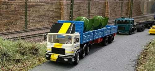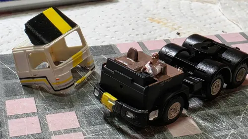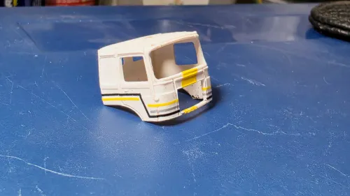 Der Film-LKW hatte ein in Wagenfabe lackiertes Unterteil des Fahrerhauses. Schwarz waren nur die Plasteeinsätze der Radkästen, siehe hier.