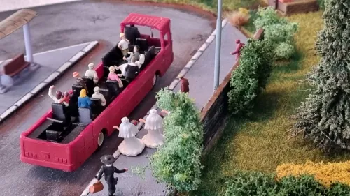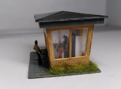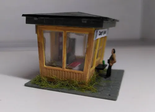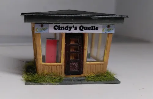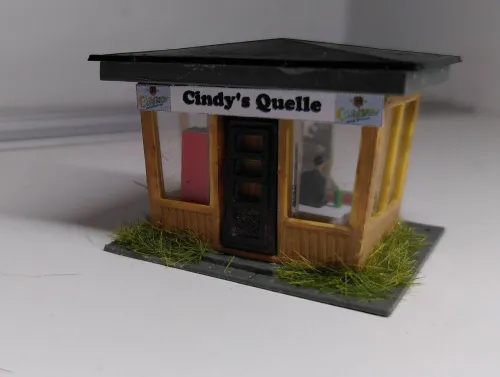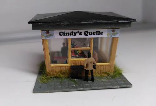 Habe den in der Gruppe gezeigt, und dann hieß es, dass man den nicht mehr nehmen könne, da er vom Maßstab her viel zu groß sei. Das stimmt auch, er ist ca. 1:100, was man vor allem an der Tür sieht. In einem ersten Schritt habe ich durch die Öffnung in der Bodenplatte die abstrakte Papierdeko entfernt, was nicht ganz geklappt hat, weil sie ausgerechnet über der Ausgabeklappe festgeklebt war. Es gibt eine neue maßstäbliche Tür, und die Werbetafel maskiert die restliche Höhe der alten Tür. Aus Litze mit grüner Isolierung habe ich Bierdosen geschnitten, eine davon steht nebst Trinker draußen an der Ausgabe. Rund um den Saum des Kiosks habe ich ein wenig begrünt, da dort natürlich nicht regelmäßig Unkraut gezupft wird.