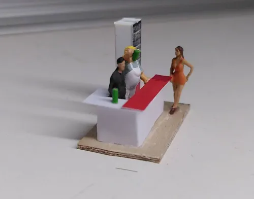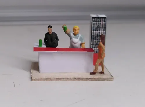 Da die fensterverdeckende Deko raus war, brauchte ich jetzt auch noch ein Innenleben. Es gibt einen spartanischen Tresen und einen Kühlschrank für die Bierdosen. Bei Cindy gibt es nur Bierdosen, die Trinker kommen trotzdem gern, was wohl vor allem an Cindy liegt. Eine Kasse hat und braucht Cindy nicht, sie rechnet direkt in ihre Geldbörse ab, die sie unter dem knappen Kleid versteckt trägt. Derzeit sind zwei Trinker in der Halle, ein Herr im feinen Anzug ist in Gedanken und hat seine Dose auf dem Tresen stehen, der andere, ein Bauarbeiter, prostet Cindy zu.