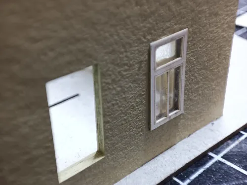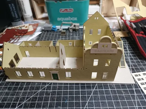 Die Außenwände standen schnell. Alles sehr passgenau, allerdings die Originalfarbgebung der Bausätze ist teilweise ...naja.. so kommt das Landhaus Typ 1 in altrosa glänzend und das Landhaus Typ 2 in blau / türkis glänzend daher, einzig das Gasthaus wäre von der Farbgebung okay, leider sieht man dort an einigen stellen die Stoßkante der einzelnen Wände. Somit entschied ich mich dazu, auch mal etwas mit Spachtelmasse "rumzuspielen". (Die Wand muss natürlich noch geschliffen werden)