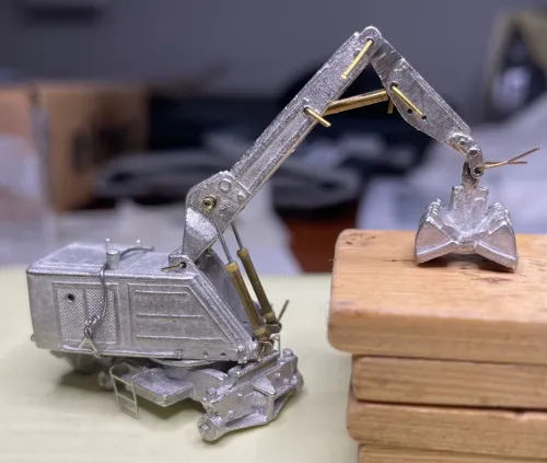 Ich hatte auch einmal angefangen, den Jano Bagger etwas beweglicher zu machen. Dazu habe ich mir von Jano einen zweiten Arm besorgt und aus den beiden Armen jeweils ein Teil gefeilt und diese dann beweglich verbunden.