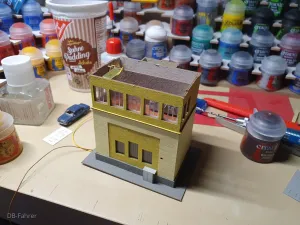 Hier das fast fertige Endergebniss, mit lackierten Dach und Wänden. Den Schriftzug werde ich nochmal Extra anfertigen da mit da dort selbst mit dünner Farbe das Schildchen zerstört wurde :nee: