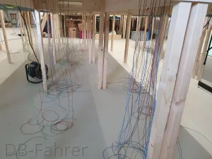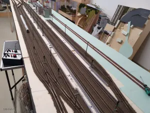 ansonsten gibt es einen kleinen zwischen Stand, die Kabel hänhen jetzt alle schonmal fest an den Gleisen (weit über 300m aber auch nur das man die gut unter den Modulen verlegen kann). Die Straba-Gleise sind geklebt und auch der Untergrund für die Stadt um diese auf Höhe der Schienenoberkante zu bringen wird momentan Stück für Stück aufgeklebt).