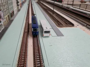 Die Straße wird auf beiden Seiten der Gleise nur einspurig, dafür mit haltemöglichkeiten. Am Bahnof sollen dafür extra Parkplätze entlang des Gehweges entstehen. Die Straßenbahngleise werden soweit geschottert (bis auf den Bahnhofsplatz). Daneben kommt ein kleiner Grünstreifen (graue Linie) mit gut 1cm Breite auf der dann auch ein Geländer drauf kommt (Sicherheit geht vor).
