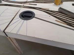 Ansonsten ging es mal wieder mit dem Schottern weiter (wobei ich hier noch kein Foto Zeige da es noch nicht geklebt wurde weil ich noch verinzelte Steine entfernen muss :wall: ). Ansonsten sitzt nun die Drehscheibe und die groben Maße für den Ringlokschuppen (hier habe ich mir mal den von Igra bestellt und ja, es werden noch ein paar Gleise mehr im freien ;) ) sind auch aufgemalt (7-9 Stände wird er bekommen) und als i-Tüpfelchen wird der Ringlokschuppen am Anlagenrand offen sein das man später in die ausgestalteten Hallen hineinblicken kann. Im Moment geht das alles etwas langsamer aber es wird :good: