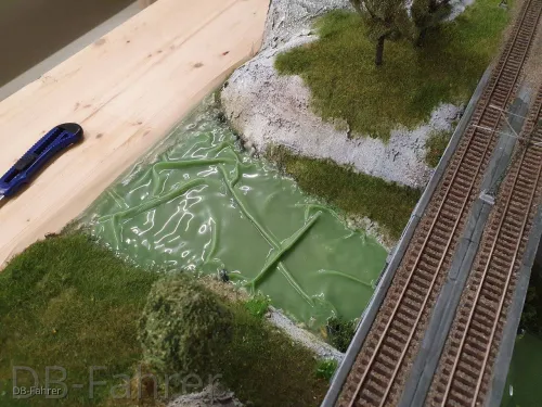 Mir schwebt das Modellbahnwasser von Woodland vor.