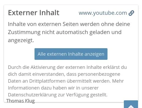 Dieser Hinweis ist jetzt als einmaliger Hinweis für alle Weiterleitungen auf externe Plattformen mit Videos oder Bildern zu quittieren.