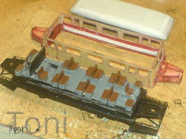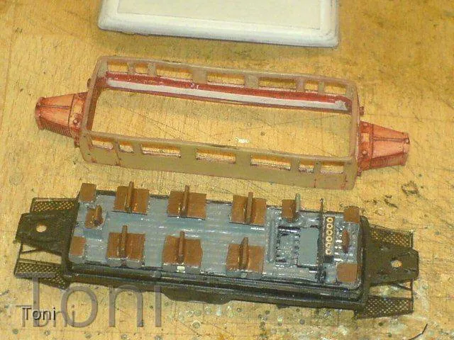 Die Buchse-Stecker-Verbindung, welche zur Trennung von Fahrgestell und Dach nebst Decoder gedacht ist, die wurde montiert, der Decoder bis auf die Anschlüsse vom Licht auch verdrahtet und zusammengesteckt passt es auch ordentlich.