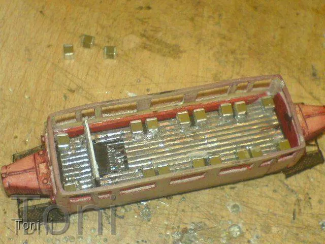 Die Kondensatoren werden dann, wenn sie an ihren äußeren Kontakten noch verdrahtet wurden, noch mit Papierattrappen für die Sitzgelegenheiten getarnt und entziehen sich dann so schon mal den Blicken der Betrachter.