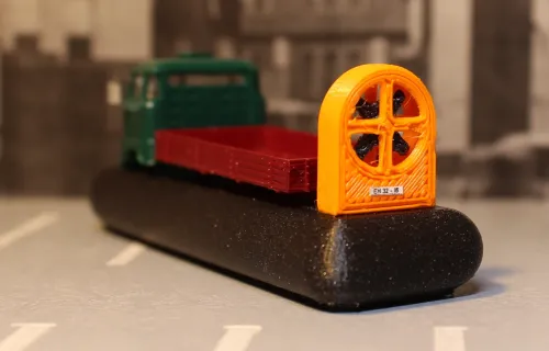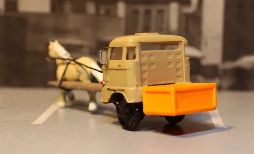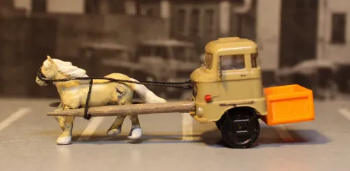 Verwendet wurden zwei uralte DDR-Modelle des W50, Inhalte aus SES-Basteltürten sowie Kleinteile von etchit und IoreDM3 . Das Pferd stammt von Panzer-Shop.nl Kettenfahrwerk, Luftkissenfahrwerk und die Pritsche des Pferdefuhrwerks habe ich auf meinem Würstchenleger selbst gedruckt. Aufgrund akuten Zeitmangels ist das Ganze eher eine Skizze zur Illustration des gespielten Witzes geworden, aber wer sich inspiriert fühlt, kann das eine oder andere sicher genauer ausarbeiten.