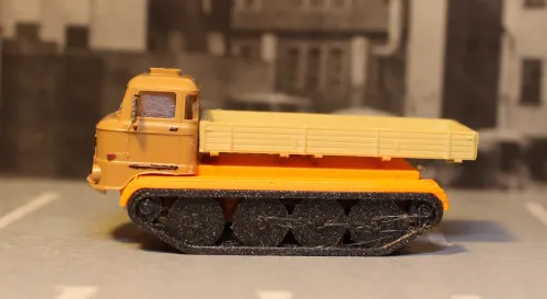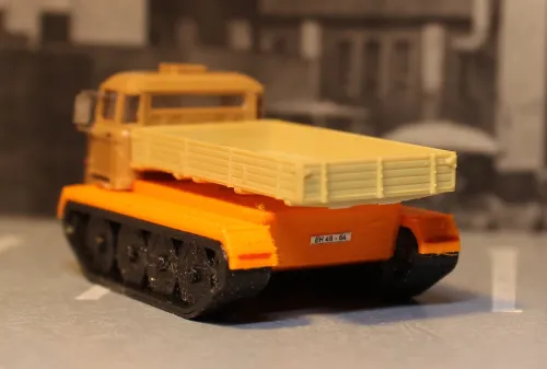 • Nachtrag zum Thema MAZ: Da ich nun schon einmal dabei war, habe ich den Dreiachser MAZ 6422 auch gleich gebaut. Und Toni, der gedruckt hat, hatte selbst (Was für ein Zufall!) die Kabine der gefacelifteten Variante von Anfang der 90er Jahre in H0 modelliert und hat sie auf TT herunterskaliert. Sie passte auf Anhieb auf mein Fahrgestell. Und dann hatte ich noch den Vorgänger von Studio Ali da, und der bekam Decals, Kennzeichen und Rückspiegel. Somit gibt es jetzt hier drei Generationen MAZ: