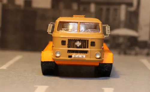Seine Folie war verschlissen, was zu unzulässiger Lichstreuung führte, wodurch die Teile ein bisschen aus der Form gingen, nicht mehr richtig zusammenpassten und z.T. mit den Stützen verschmolzen. Dann hat er die Teile mangels Erfahrung viel zu lange gehärtet, wodurch sie spröde wie Glas wurden. Das führte u.a. dazu, dass beim Bauen fast alle Steckachsen abgebrochen sind, die für die Bohrungen in den Rädern nun ohnehin zu groß waren. (Aufbohren hat allerdings auch einige Räder zerstört.) Ich habe dann versucht, die Räder einfach irgendwie an den Rahmen zu kleben. Die Vorderachskonstruktion ist ein bisschen massiver, war aber durch die Fehler beim Druck z.T. so verzogen dass die Vorderräder viel zu viel Abstand zum Fahrerhaus bekamen. Apropos Räder: Wie man auf den Bildern sieht, haben sie größtenteils alle Details des Felgendesigns verloren.