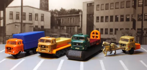 PS: Der modernere soll erst bei Toni Kennzeichen kriegen, der rote 6422 mit Ritter-Sport-Auflieger hat lettische Kennzeichen bekommen, so wie die LKW heute noch gelegentlich im Baltikum zu sehen sind, dann steht da der 5432 mit Karl-Marx-Städter Nummer, wie er verwichtelt wurde, der MAZ 504 hat sowjetische Kennzeichen bekommen, und der zweite 5432 wartet mit fiktivem Middelstedter Kennzeichen darauf, im Frühjahr den Auflieger des Übertragungswagens zu bekommen, so wie das Gespann immer noch in Deutschland existiert.