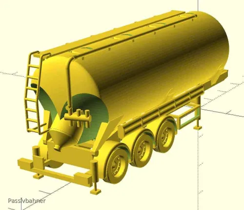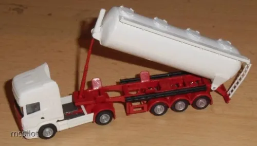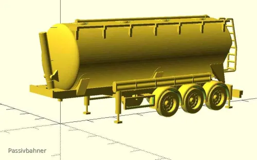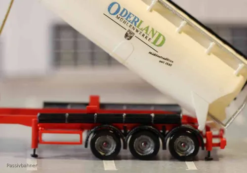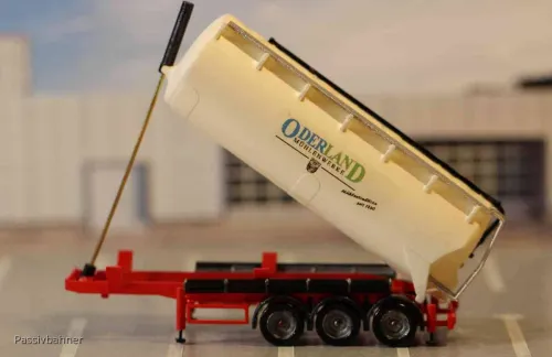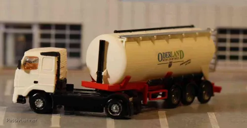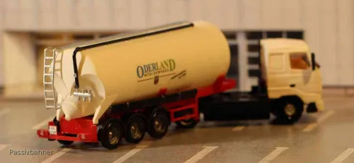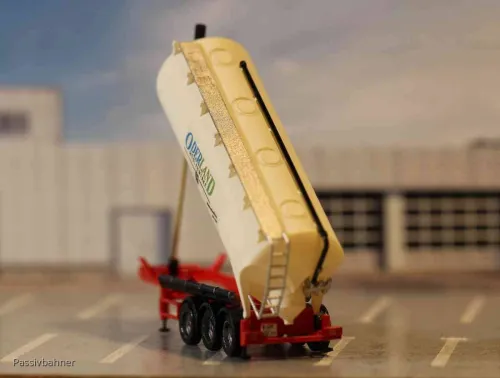 Ständig stiftet mich jemand an, erst Toni zu den "Auf Achse"-LKW, dann exiswelt zu einem Auflieger. Er meinte immer, ich soll doch mal ein paar Anbauteile machen, mit dem man aus dem Herpa-Tankauflieger einen Siloauflieger machen kann. Habe ich mir kurz angesehen und dann verworfen, da 1) das Vorbild des Herpa offenbar selbsttragend ist, die Siloauflieger, die ich kenne, aber einen stabilen Rahmen haben und 2) so lange Silos in Deutschland eher selten sind. Habe mir dann ein Vorbild bei Feldbinder gesucht und den Auflieger dann von Grund auf selbst gemacht. Zugmaschine ist der Volvo FH von etchit: