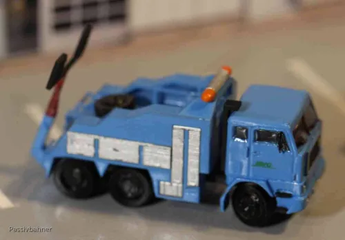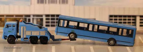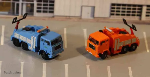 Hab mir die Bilder noch einmal angesehen und bin nicht ganz sicher, ob die unterschiedliche Wirkung von der Verglasung kommt. Beim Abschlepper sind das Interieur, der Frontscheiben-Mittelsteg und die Scheibenwischer geschwärzt. Das ist beim Gabor-Fertigmodell nicht der Fall. Der dunkle Hintergrund trägt meiner Meinung nach zu dem optischen Eindruck bei, dass die Scheiben kleiner wären.