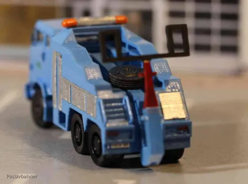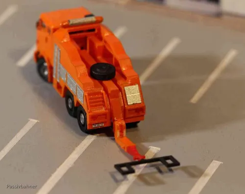 Beim Bauen stellte sich dann als Problem heraus, dass ich beim Zusammenstecken der Teile die hintere Anhängerkupplung nicht am hinteren unteren Abschluss vorbeibekam, weshalb der dann per Seitenschneider ersatzlos weichen musste. In der überarbeiteten Fassung wird der Heckabschluss dann ein separates Teil sein. Hier mal Bilder vom fertigen Fahrzeug:
