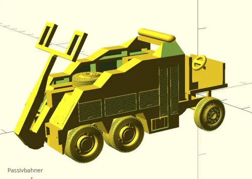 Eine Zeichnung hatte ich dafür nicht, aber in verschiedenen Quellen findet man Angaben zu Länge, Breite, Höhe, Radstand und Spur, und so habe ich das Fahrzeug als Bausatz in OpenSCAD modelliert: