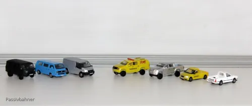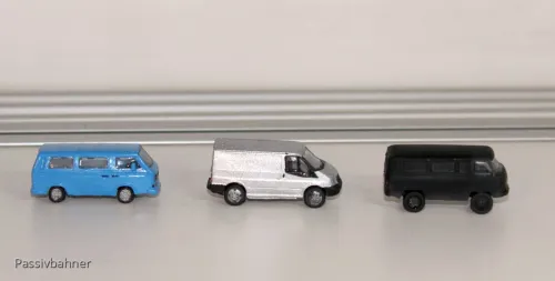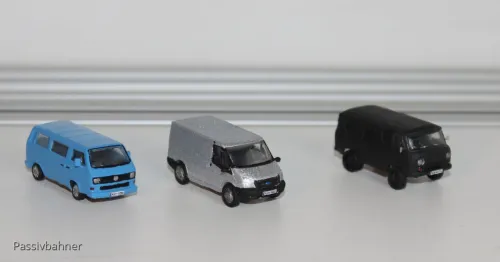 UAZ 452, VW T3 Bus und Ford Transit Modelljahr 2006 sind aus dem 3D-Drucker eines Freundes. Da man den UAZ nach wie vor neu in Deutschland kaufen kann, erhielt er neben Scheibenwischern und Spiegeln von PTL auch Eurokennzeichen. Den T3 habe ich als Caravelle lackiert, Fahrgestell/Interieur habe ich selbst gedruckt, Räder mit Leichtmetallfelgen selbst entworfen und bei Shapeways drucken lassen. Der Transit kam auch als Karosse, Fahrgestell und Räder sind von mir.