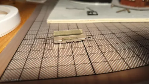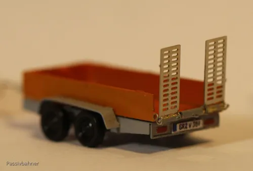 Die von Hädl vorgesehene Lösung für die Besfestigung der Rampen hätte ein sehr wackliges und klappriges Endprodukt ergeben, da sie auf einen dünnen Draht aufgefädelt werden sollten, und zwar durch Ösen an den Rampenblechen. Auf Abstand wurden sie von einem kleinen beigelegten Röhrchen gehalten. Dann hätten die Drahtenden durch Ösen an den Seitenblechen des Anhängers geführt werden sollen und anschließend irgendwo seitlich fixiert. Neben der Wackligkeit des Endergebnisses gefiel mir auch nicht der seitlich herausstehende sichtbare Draht. Bernd ( @ka-1111 ) hatte eine bessere Lösung parat, die ich dann auch umgesetzt habe. Ich habe weitere Messingröhrchen besorgt und zwischen den Ösen der Bleche verklebt. Das mittlere Distanzröhrchen verklebte ich mit dem Draht. Die Bleche konnten nun rechts und links auf den Draht gesteckt werden, und die Messingröhrchen sorgen für einen ausreichend festen Sitz, die Bleche lassen sich aber weiterhin klappen. Das mittlere Röhrchen verklebte ich mit dem Anhängerheck, und die immer noch vorhandenen Ösen an den Seitenwänden verhindern, dass die Rampenteile seitlich wegrutschen. Das Ergebnis sieht so aus: