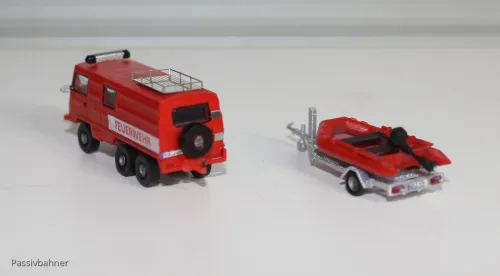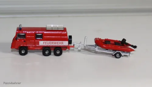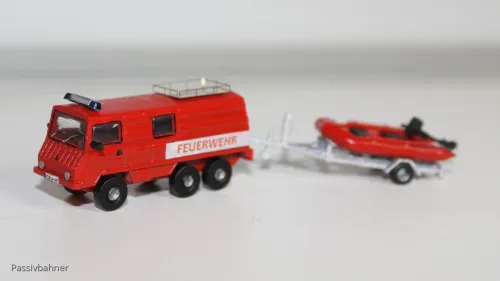 Der Bootsanhänger mit Boot ist ein Bausatz von Yellow Dwarf. Der Pinzgauer ist ein unlackiertes 3D-Druckteil von Modellbahn Union. Ich habe ihm Fenster aus MKK, ein selbst entworfenes Sondersignal, selbst entworfene Rückspiegel, eine improvisierte Anhängerkupplung aus Plastikresten, Trittstufen am Heck aus Metallresten sowie Scheibenwischer und einen Dachaufbau von IoreDM3 spendiert. Decals mit dem Feuerwehrschriftzug habe ich ebenfalls selbst angefertigt. Leider neigt sich das Sondersignal nach hinten, da der Sekundenkleber seinem Namen gerecht wurde und ich gerade geschafft habe, das Sondersignal so auszurichten, dass es von vorn und von oben gerade ist. Ohne größere Zerstörungen lässt sich das nun leider nicht mehr ändern.