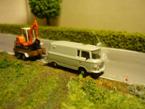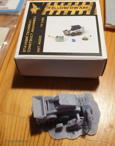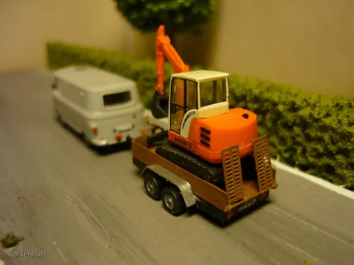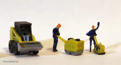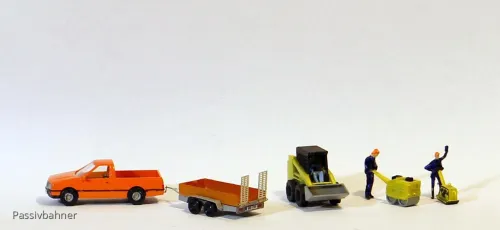 Eine Anhängerkupplung lag auch bei, und so brauchte ich ein passendes Zugfahrzeug. Die Wahl fiel auf den Auhagen Pickup. Dieser wurde mit orangem Autolack lackiert, Details wie Scheinwerfer, Türgriffe usw. farblich behandelt, und Kennzeichen beam er genau wie der Anhänger auch. Nun fehlte auch noch die Ladung, und da wurde ich bei Yellow Dwarf in Tschechien fündig. Da gibt es ein in SLA-Druck entstandenes Set aus einem Minibagger, einer Walze und einer Rüttelplatte. Der Minibagger stellte sich als etwas zu groß für den Anhänger heraus, also beschloss ich, die Werkzeuge nicht als Ladung, sondern in Benutzung darzustellen. Der Baggerfahrer ist ein blau gekleideter Fahrgast aus irgendeinem Set, weil der einzige sitzende Bauarbeiter, den ich in einem Noch-Bauarbeiterset fand, für den Bagger zu fett war. Die Bauarbeiter an den anderen beiden Geräten sind aus Maxisets von Noch und Preiser und waren unbemalt. Hier der Bausatz von Yellow Dwarf und das Endergebnis: